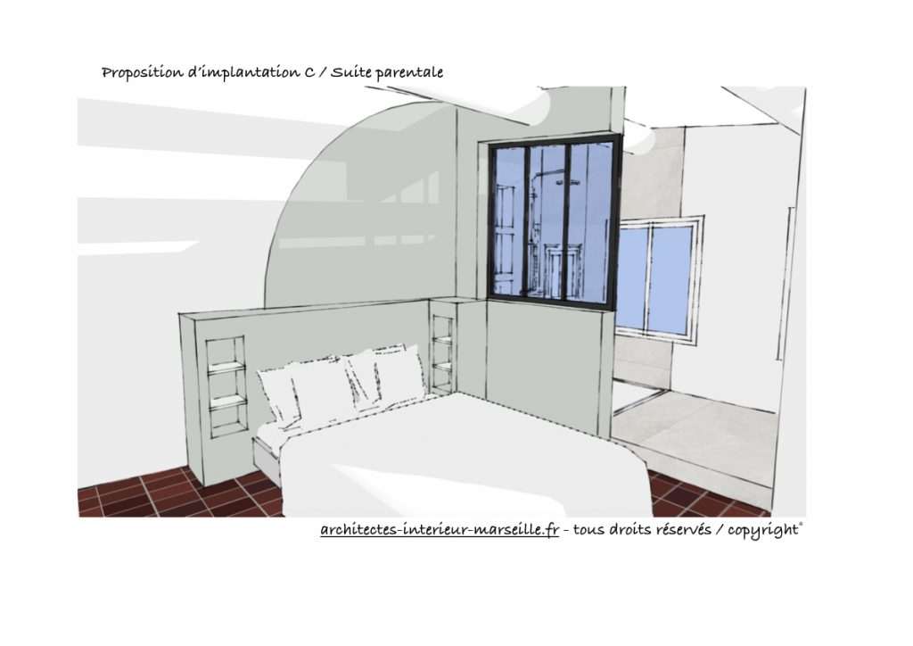 Croquis d’esquisse d’aménagement d’une suite parentale par architectes d’intérieur 13008