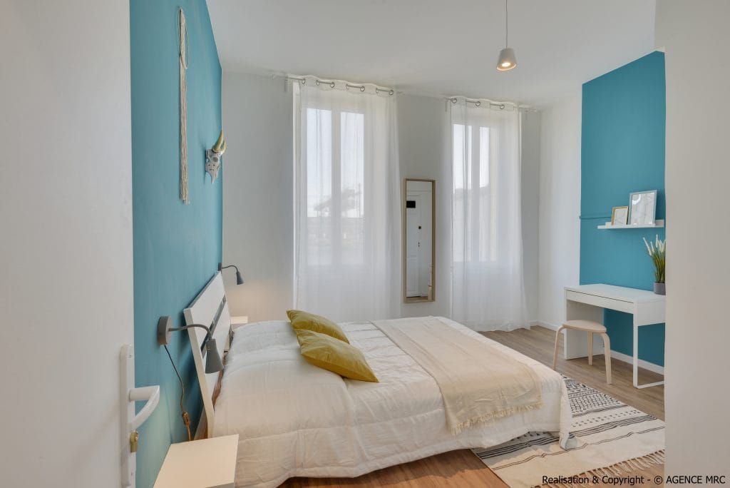 Une palette de couleurs douces particulières est associée au décor global et  qui comprend des teintes de bleu, de blanc, de jaune et de vert. Ainsi, lors de la décoration d’’ensemble, nous avons pu crée un effet net et apaisant sur le design de se duplex.