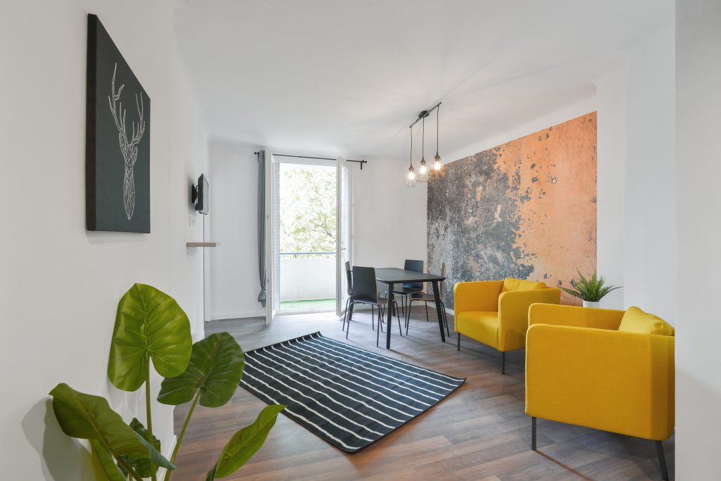 Comme mentionné, cette appartement à été crée au travers d’une d’un design d’intérieur scandinave. Par conséquent pour ce projet nous avons choisir de mettre l’accents décoratifs su des motifs simples et des couleurs douce et éclairante.